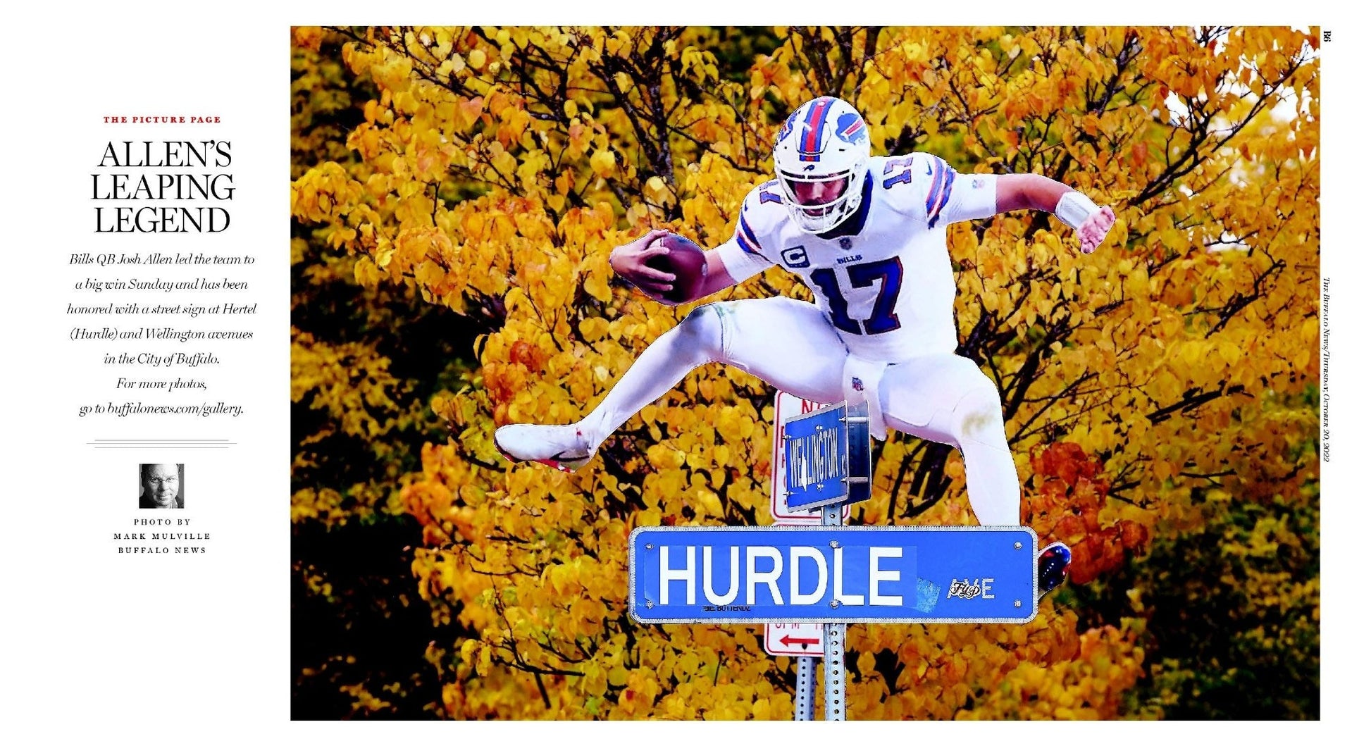 Bills QB Josh Allen led the team to a big win Sunday and has been honored with a street sign at Hertel (Hurdle) and Wellington avenues in the City of Buffalo. October 20, 2022.