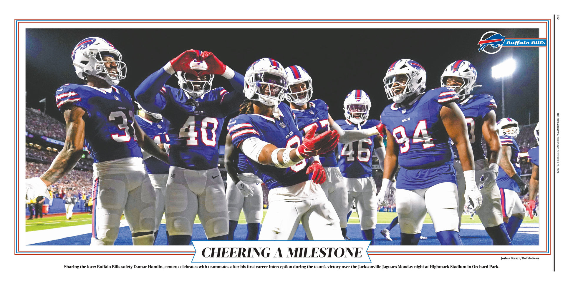 Bills safety Damar Hamlin celebrates his first career interception during their victory over the Jaguars.