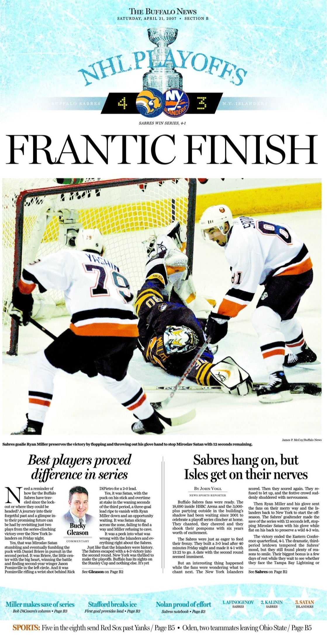 Sabres goalie Ryan Miller preserves the victory by flopping and throwing out his glove hand to stop Miroslav Satan with 12 second remaining.