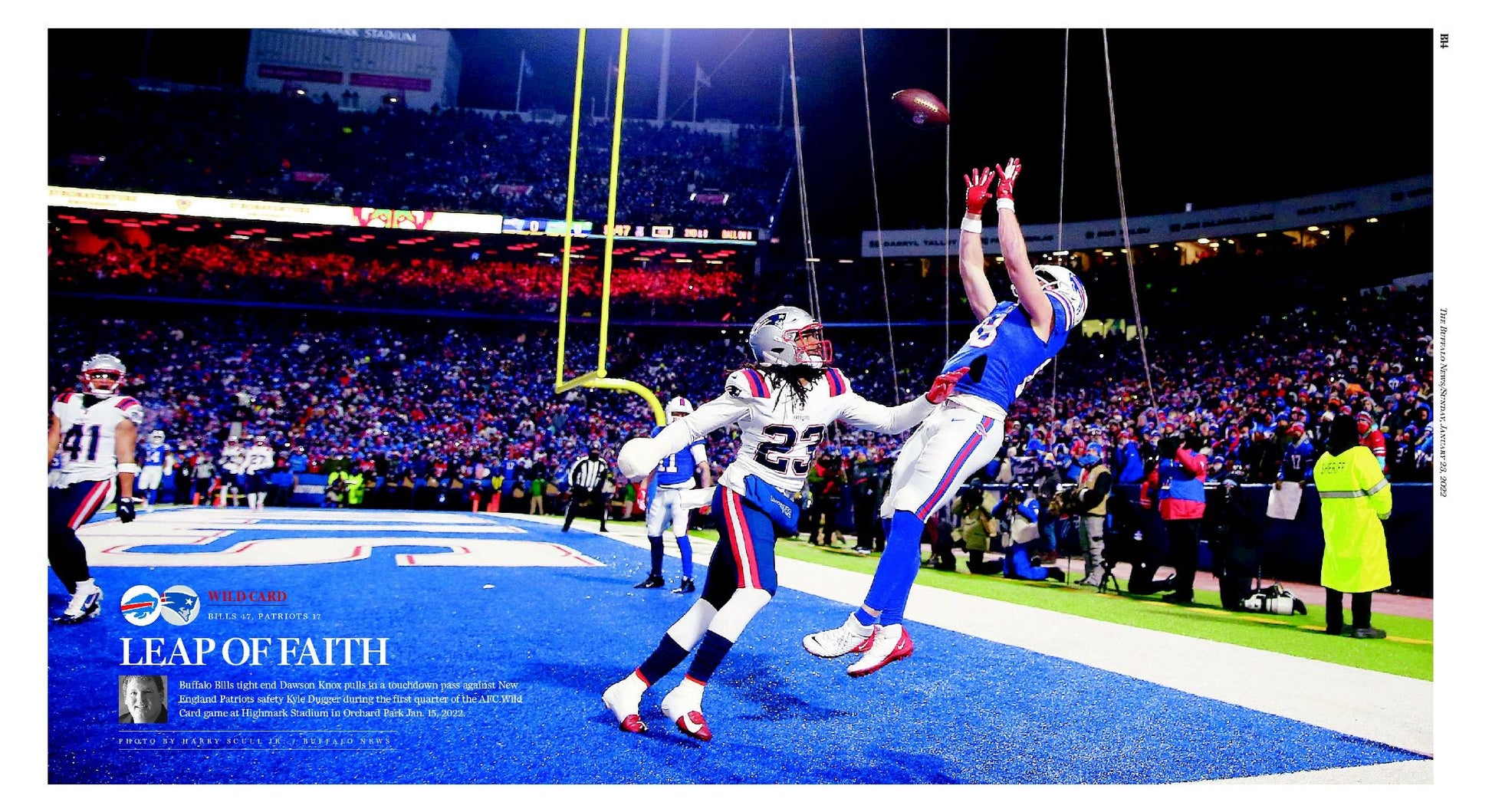 "Leap of Faith" collectible poster, Buffalo Bills tight end Dawson Knox pulls in a touchdown pass against New England Partiots safety Kyle Dugger during the first quarter of the AFC Wild Card game at Highmark Stadium in Orchard Park Jan 15, 2022.