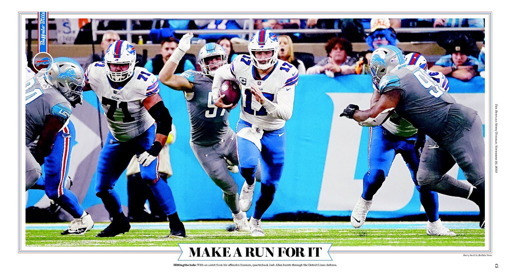 Hitting the holes: With an assist from his offensive linemen, quarterback Josh Allen bursts through the Detroit Lions defense.