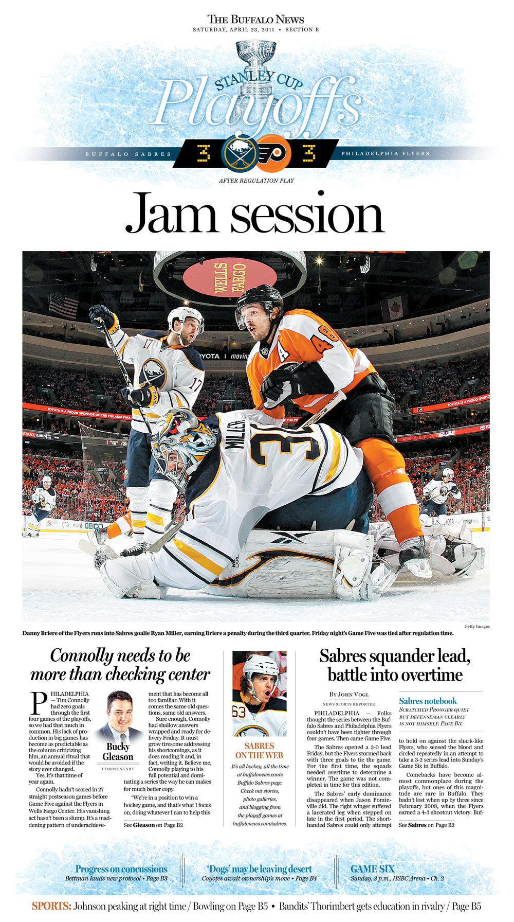 Sabres- Danny Briere of the Flyers runs into Sabres goalie Ryan Miller, earning a penalty during the third quarter. Friday nights Game Five was tied after regulation time. April 23, 2011.