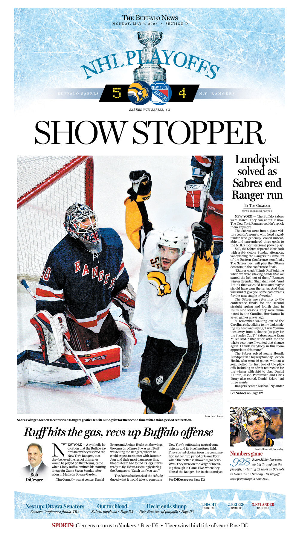 Sabres winger Jochen Hecht solved Rangers goalie Henrik Lundqvist for the second time with a third-period redirection. Printed May 7, 2007.