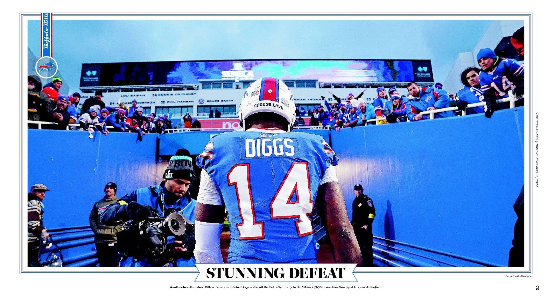 Another heartbreaker: Bills wide receiver Stefon Diggs walks off the field after losing to the Vikings 33-30 in overtime Sunday at Highmark Stadium.