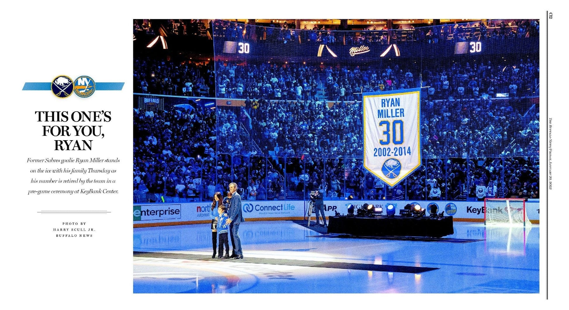 Former Sabres goalie Ryan Miller stands on the ice with his family Thursday as his number is retired by the team in a pre-game ceremony at KeyBank Center.