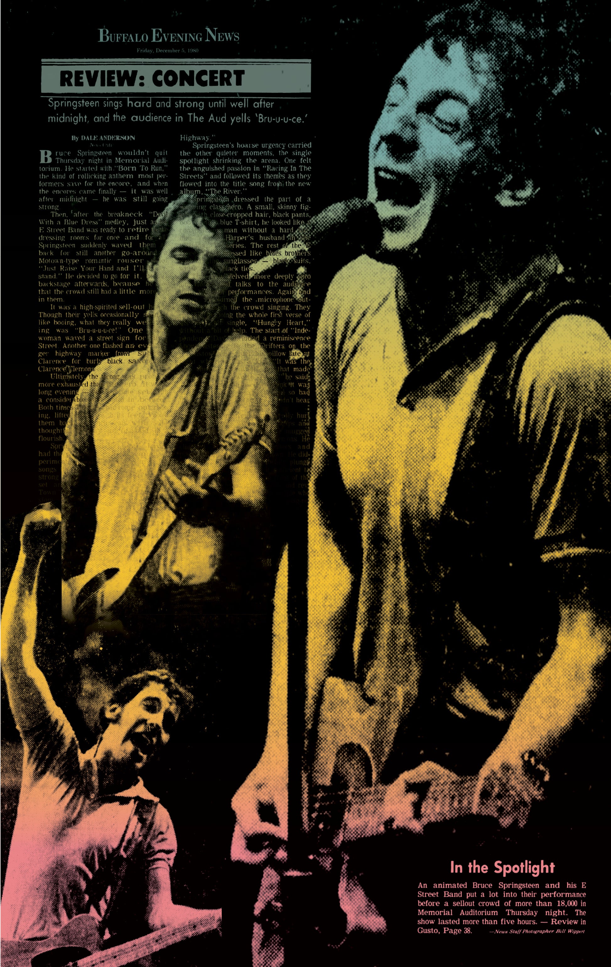 Buffalo Evening News photos and concert review from Springsteen's "The River Tour" concert at the Buffalo Memorial Auditorium on December 6, 1980.